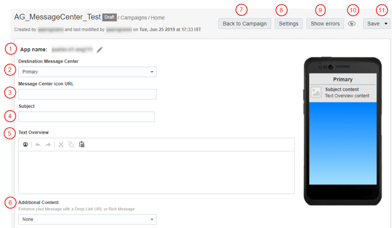 Contenu supplémentaire : Insérez tout contenu supplémentaire dans le message, tel qu'une URL de lien profond ou un Message enrichi. (Pour plus d'informations sur ces types de contenu, voir Centre de messagerie - Concevoir une campagne.)