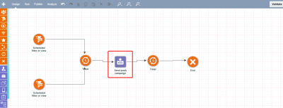 Après avoir créé la campagne par centre de messagerie, vous pouvez l'inclure dans des programmes. Lorsque vous concevez une orchestration de programme, utilisez la phase de l'activité Envoyer une campagne Push pour envoyer les campagnes par centre de messagerie à votre audience.
