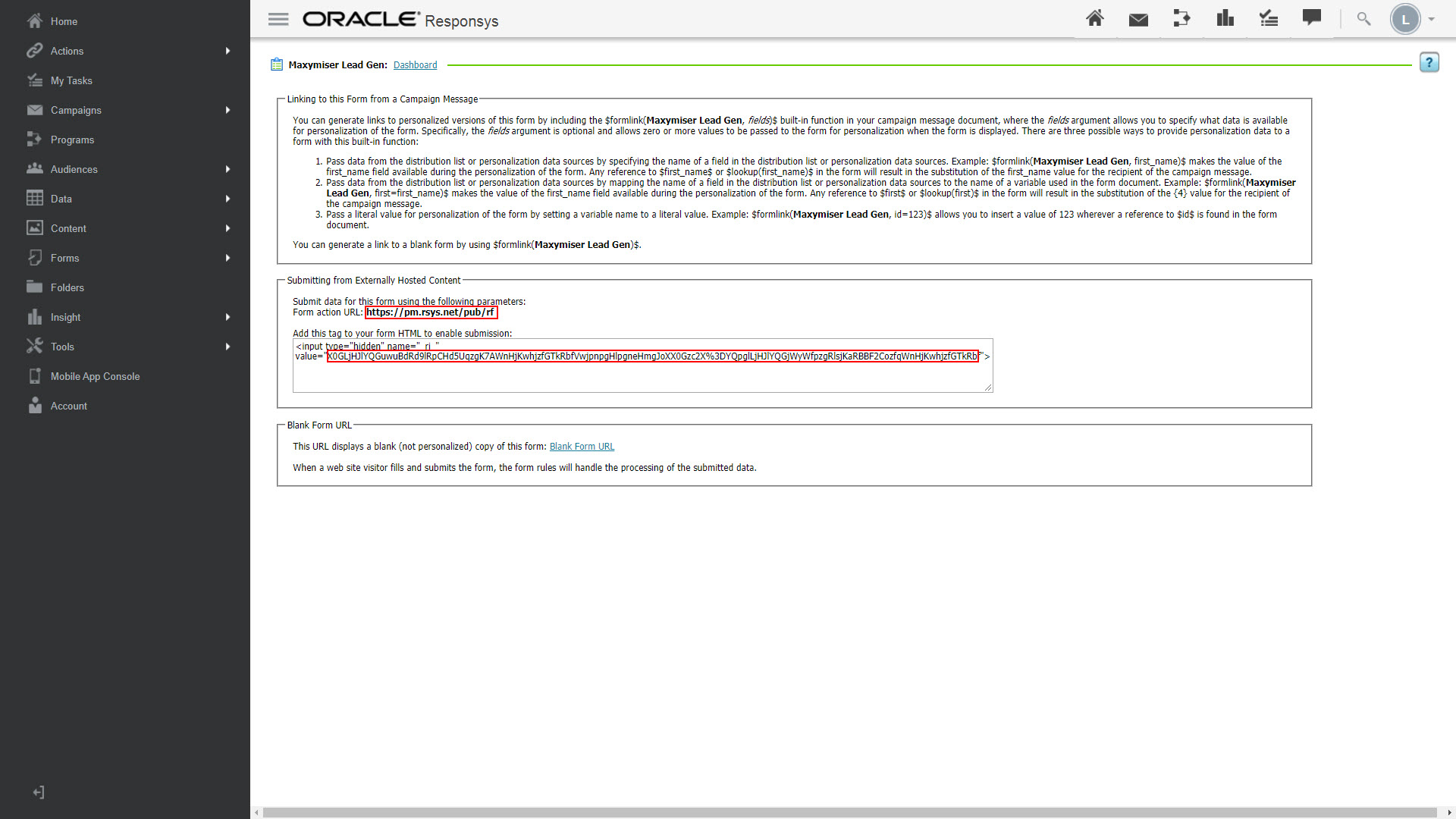 - Dans Responsys, copiez et collez les paramètres du formulaire.
