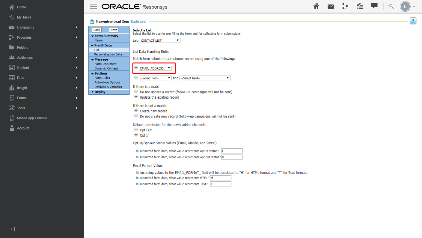 - Dans Responsys, créez un formulaire de génération de pistes.