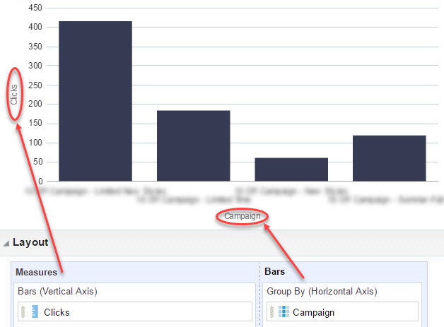 - Barre, Linee e così via: il nome di questa sezione varia a seconda del tipo di grafico selezionato. Per selezionare l'oggetto per il quale rappresentare i valori, trascinare le colonne in questa sezione. Ad esempio, se si seleziona Campagna in un grafico a barre, ciascuna barra rappresenterà una campagna.