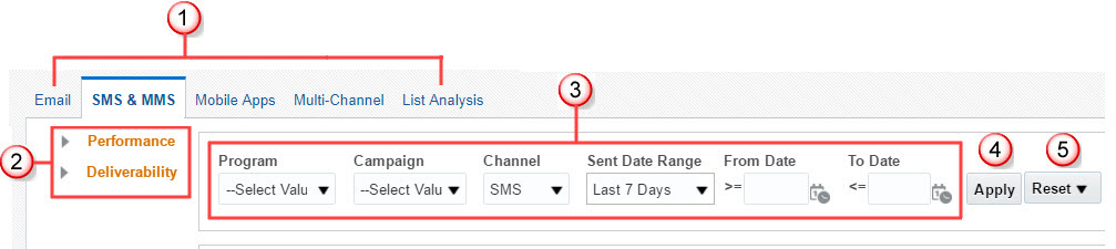 I dashboard interattivi Insight sono uno strumento completo per l'analisi delle prestazioni di tutti i canali in uso. In Oracle Responsys sono disponibili dashboard e dashboard secondari per ogni canale: E-mail, SMS e MMS e Applicazioni mobile. Per una panoramica dei dashboard, vedere Panoramica dei dashboard.