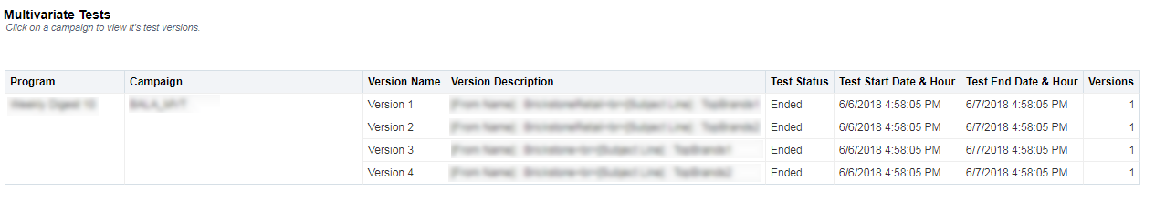 La tabella Test multivariati indica tutti i test eseguiti per una campagna. Per visualizzare i test di una campagna specifica, fare clic sul nome della campagna.