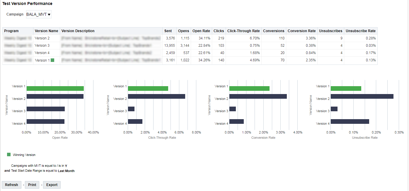 La tabella e i grafici Prestazioni versione test mostrano i risultati di tutti i test della campagna selezionata nella tabella Test multivariati.