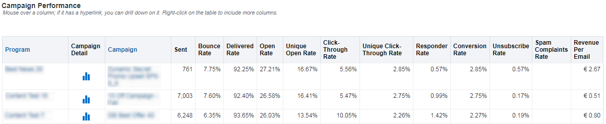 Questo report fornisce una vista in formato tabulare delle prestazioni delle campagne inviate entro l'intervallo di date specificato. Per una panoramica delle campagne, fare clic qui.