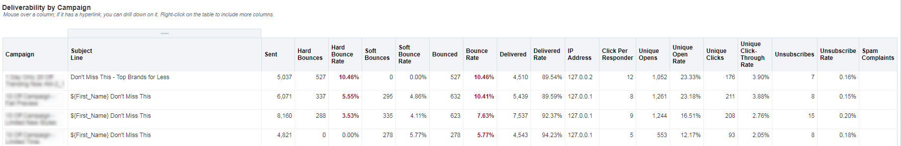 Fornisce una vista in formato tabulare della recapitabilità per il canale e-mail. Per un'analisi più dettagliata, è possibile eseguire il drill-down su Programma, Campagna, Area e ISP.