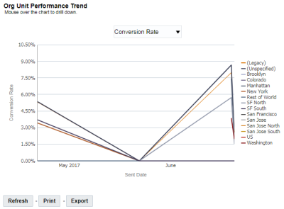 Questo grafico consente di seguire l'andamento delle metriche delle prestazioni per le unità organizzative con le migliori prestazioni. Utilizzare il menu a discesa per passare da una misura all'altra: Tasso di click-through, Tasso di conversioni, Tasso di recapitati, Tasso di aperture, Ricavi per e-mail, Inviati, Tasso di annullamento sottoscrizioni.