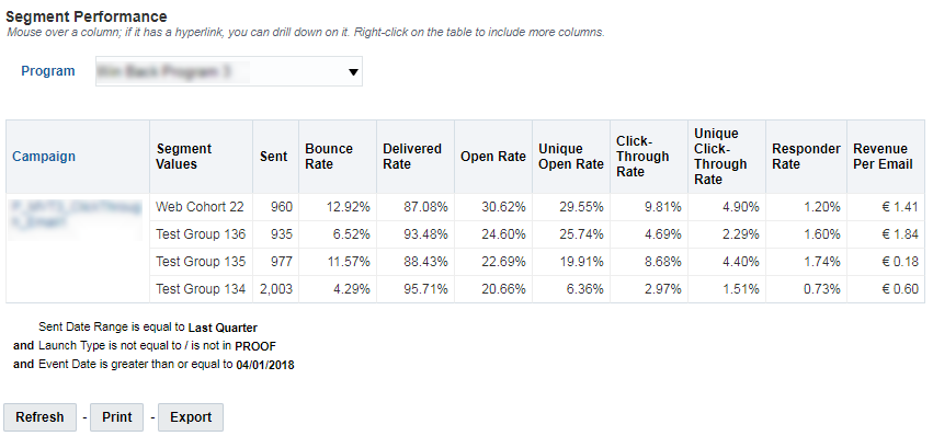 Il dashboard Segmento fornisce una vista in formato tabulare delle metriche delle prestazioni per i valori di segmento associati a una campagna e-mail.