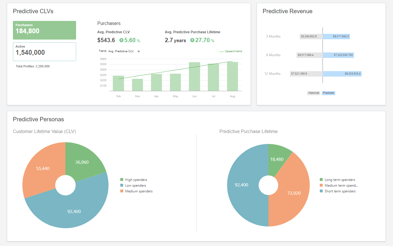 Questa funzionalità si basa su una combinazione di algoritmi di apprendimento automatico e intelligenza artificiale in grado di comprendere il modo in cui si sta evolvendo la relazione con un cliente. Non appena il motore di previsione viene connesso al database, fornisce i valori CLV dei clienti in base alle ultime informazioni disponibili. Questa operazione avviene, naturalmente, in tempo reale.