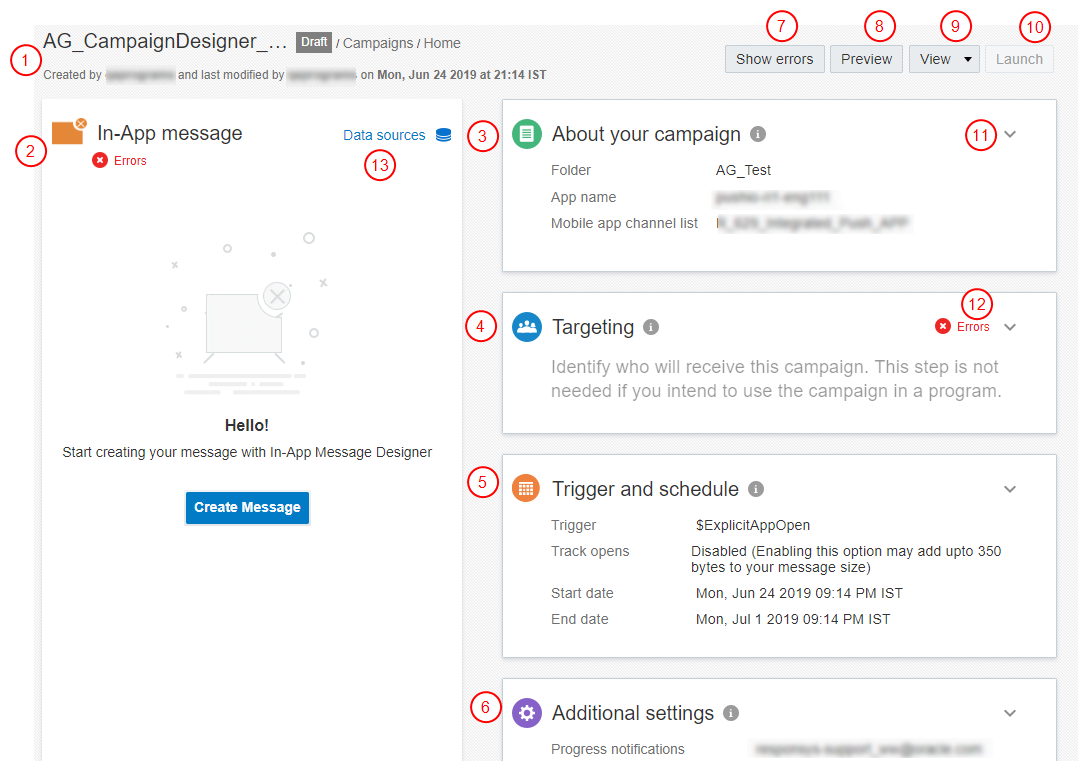 Utilizzare Progettazione campagna per esaminare i dettagli della campagna selezionata, visualizzare gli eventuali errori da correggere ed eseguire molte altre operazioni. Fare clic su per espandere il pannello. Per ulteriori informazioni, vedere Lancio di una campagna in-app con la nuova funzionalità Progettazione campagna.