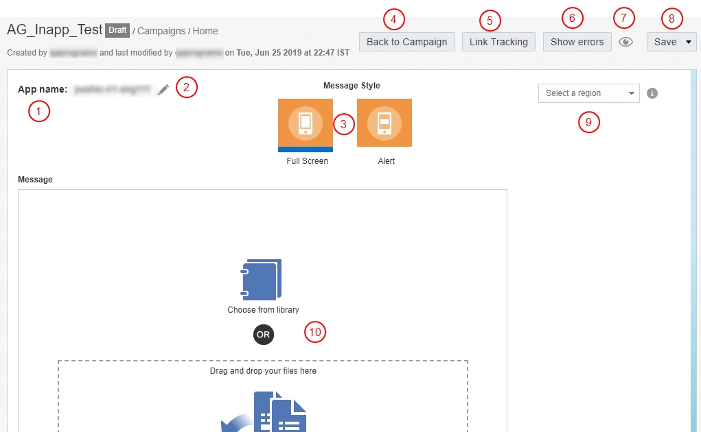 Nota: a seguito della release 19C, la cartella di lavoro campagna in-app ora dispone di un'interfaccia aggiornata ed è denominata Progettazione campagna in-app. A differenza di quanto è avvenuto con Progettazione campagna, non sono state apportate modifiche significative all'interfaccia di Progettazione messaggio. Progettazione campagna e-mail è abilitata per tutti i nuovi account successivi alla release 19C e viene fornita in disponibilità controllata per gli account esistenti. Per accedere a questa funzionalità per gli account esistenti, eseguire il login a My Oracle Support e creare una richiesta di servizio. Per ulteriori informazioni relative a questa modifica, vedere Modifiche introdotte con Progettazione campagna in-app.