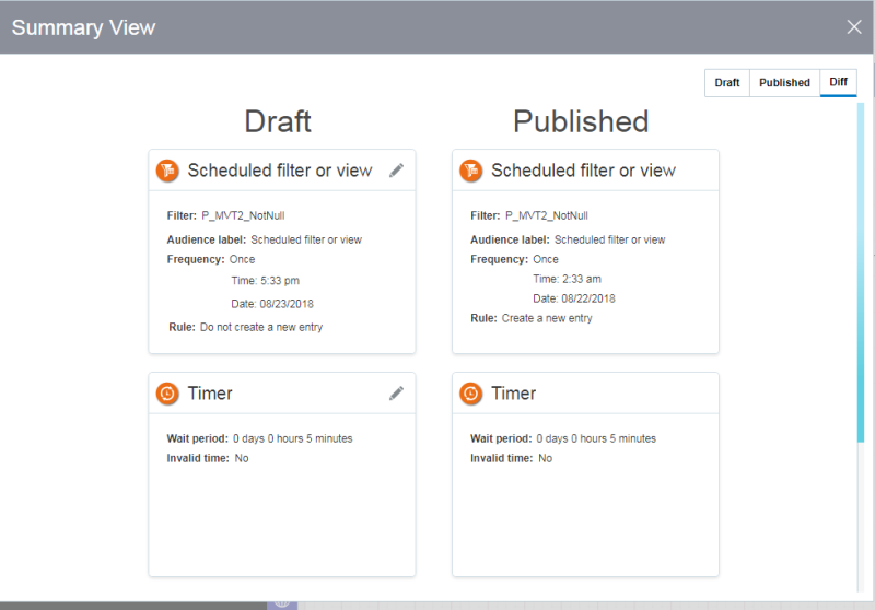 Fare clic su Diff. per visualizzare il programma in bozza e pubblicato affiancati per confrontarne le configurazioni.