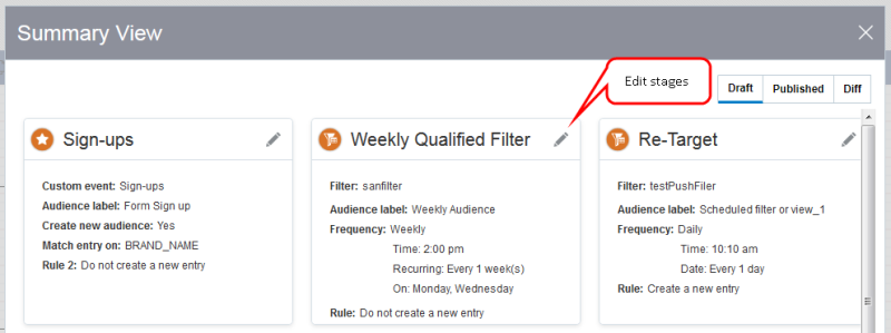Se un programma è stato pubblicato, è anche possibile configurare programmi in bozza nella vista Diff., che consente di affiancare le configurazioni del programma in bozza e del programma pubblicato per visualizzarne le differenze. Fare clic su Modifica per configurare fasi per il programma in bozza.