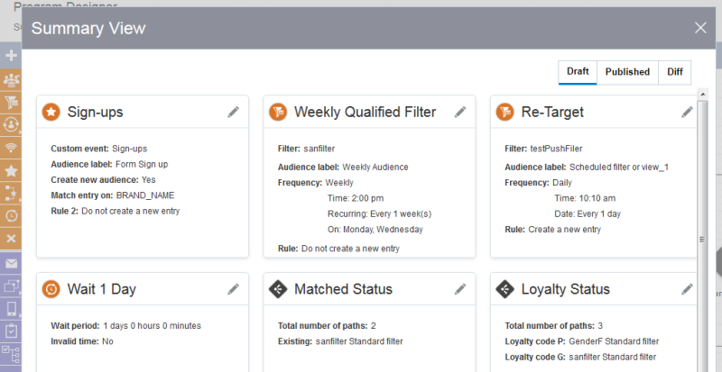 La vista Riepilogo programma visualizza le configurazioni di tutte le fasi del programma in un'unica vista per consentire agli addetti marketing di progettare e gestire con facilità i programmi senza doverli aprire manualmente ed esaminarne ogni fase. Questa vista offre visibilità di alto livello sulle configurazioni delle fasi del programma, per consentirne la verifica per i programmi in bozza e pubblicati. Affiancare le configurazioni delle fasi per i programmi in bozza e pubblicati per confrontarle e visualizzare le differenze.