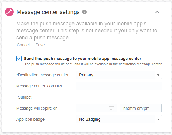 Utilizzare il pannello Impostazioni centro messaggi per inviare il messaggio al centro messaggi oltre a una notifica push. In questo pannello è possibile definire le impostazioni specifiche del centro messaggi. Per ignorare le modifiche apportate nel pannello, fare clic su Annulla. Per salvare le modifiche, fare clic su Salva. Sono disponibili ulteriori informazioni sull'invio del messaggio al centro messaggi e il badge dell'icona dell'applicazione.