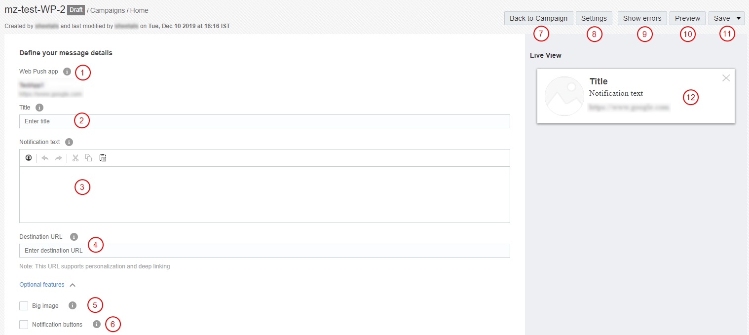 Utilizzare Progettazione messaggio push Web per creare e modificare i messaggi e impostare le opzioni della campagna.