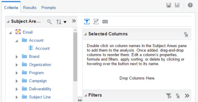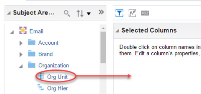 보고서 생성에 사용할 수 있는 모든 열은 왼쪽의 주제 영역 창에 그룹화되어 있습니다. 각 폴더를 펼쳐 사용 가능한 열을 확인합니다. 사용 가능한 모든 측정기준은 측정기준 폴더에 그룹화되어 있습니다. 이 폴더는 두 개의 하위 폴더인 전달성 측정기준 및 응답 측정기준으로 구성됩니다.