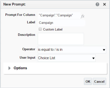 - 보고서의 열을 사용하여 프롬프트를 생성하려면 원하는 열을 선택합니다.