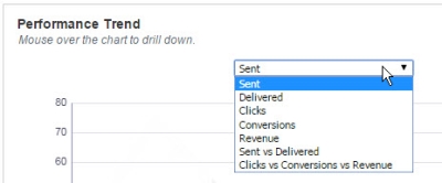 캠페인에 대한 전송됨, 전달됨, 클릭 수, 전환 수 등의 성과 척도 추세를 나타냅니다.