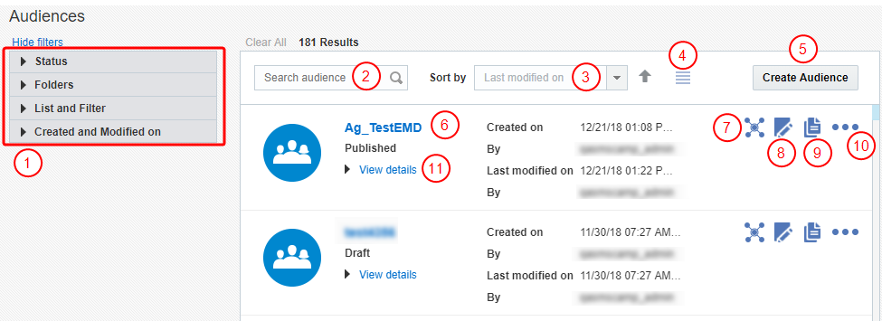 대상자 페이지를 사용하여 하나의 중앙 위치에서 대상자를 관리할 수 있습니다. 이 페이지에는 대상자에 사용되는 모든 필터를 비롯하여 계정의 모든 대상자가 표시되며 대상자를 편집, 게시 및 분석할 수 있는 기능이 제공됩니다.
