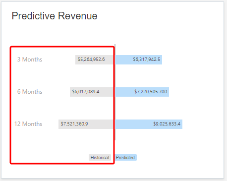 두번째 뷰는 세 가지 예측 기간(다음 3개월, 다음 6개월, 다음 12개월)의 총 예측 매출을 표시합니다.