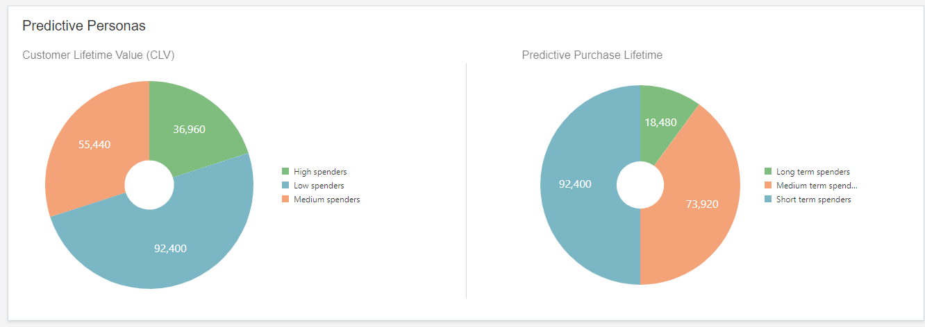 - 예측 구매 수명: 모든 프로파일의 예측 구매 수명 범위를 계산하여 3명의 가상 사용자로 나눕니다. 예를 들어, 최소 예측 구매 수명이 1일이고 최대 예측 구매 수명이 3,001일이면 범위 3,000일을 3명의 가상 사용자로 나눕니다. 예를 들어, 예측 구매 수명이 2일인 프로파일은 첫번째 가상 사용자인 단기 소비자에 해당하고, 1,500일인 프로파일은 중기 소비자에 해당하고, 2,500일인 프로파일은 장기 소비자에 해당합니다. 가상 사용자 범위는 동적으로 변경되며, 가상 사용자의 프로파일 수가 해당 가상 사용자의 원형 차트 섹터에 표시됩니다.