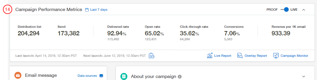 캠페인 성과 지표. 캠페인 성과 지표 패널을 사용하면 캠페인 디자이너를 나가지 않고도 캠페인 성과를 평가할 수 있습니다. 캠페인 디자이너 상단에 있는 이 패널은 라이브 실행이나 검증 실행이 시작 또는 스케줄링된 후에만 표시되고, 지표는 라이브 또는 검증 실행이 시작된 후에만 표시됩니다.
