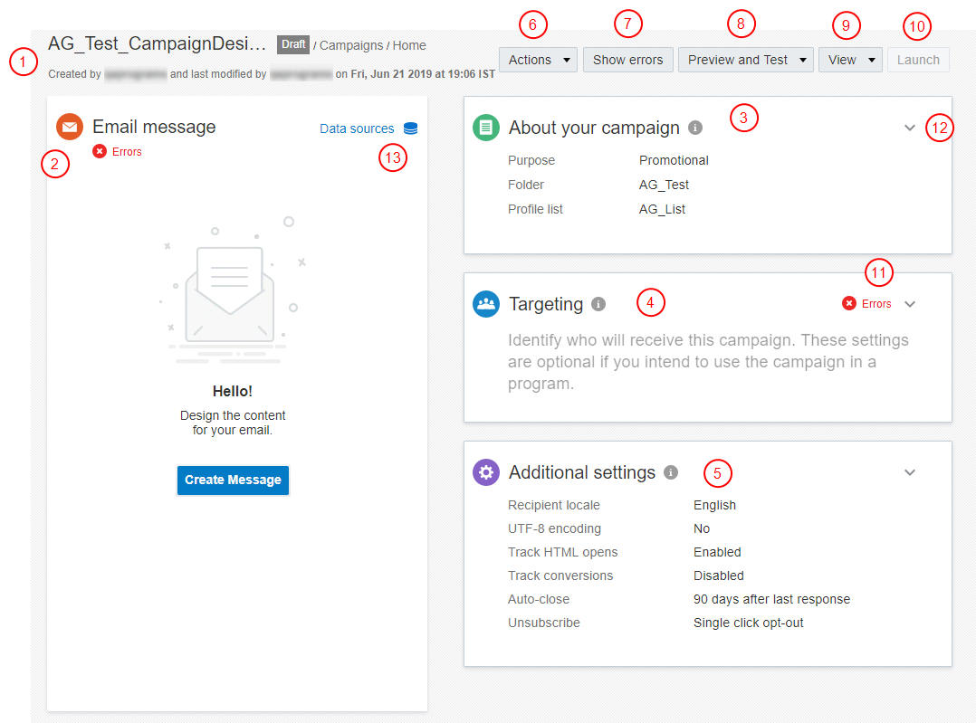 캠페인 디자이너를 사용하여 선택한 캠페인의 세부사항을 검토하고 수정해야 하는 오류를 확인할 수 있습니다. 을 눌러 패널을 확장합니다. 새 캠페인 디자이너를 사용하여 전자메일 캠페인 실행하는 방법을 자세히 알아보십시오. 모든 캠페인 실행을 모니터링하거나 캠페인 실행에 대한 작업을 수행하려면 캠페인 모니터를 사용합니다. 캠페인 디자이너의 여러 섹션과 각 섹션 요약을 확인합니다.
