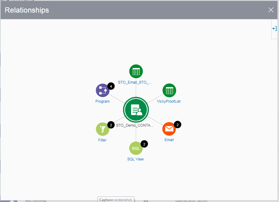 프로그램 관리 페이지, 캠페인 관리 페이지, 대상자 페이지 및 검색 결과에서 관계 보기는 행의 프로그램, 캠페인 또는 데이터 객체 옆에 있습니다.