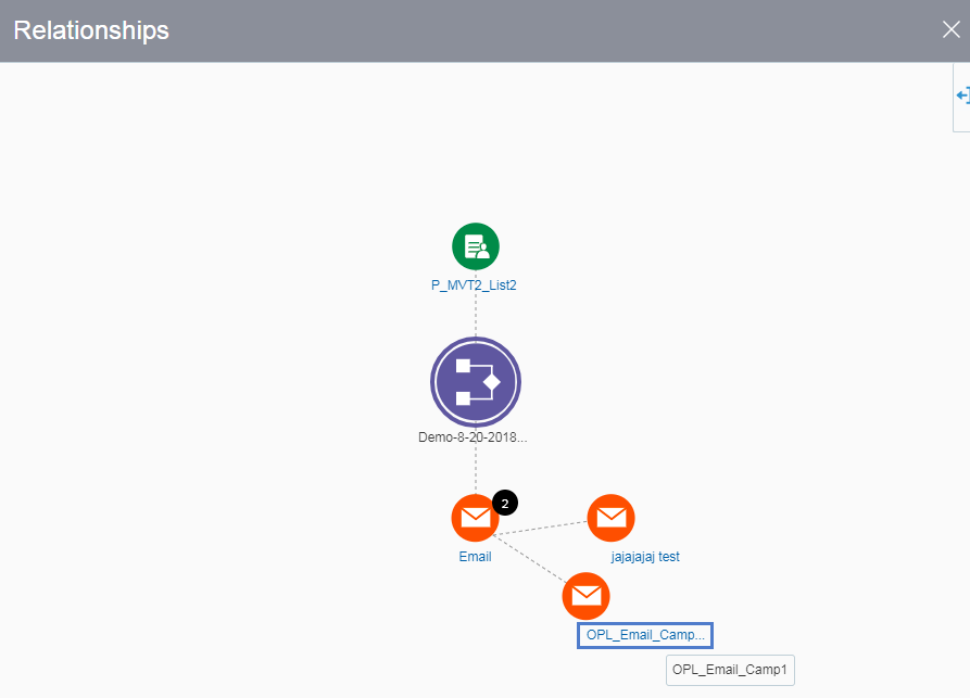전자메일 캠페인을 예로 들면, 객체 관계 네비게이터를 사용하여 프로파일 목록, 필터, 링크 테이블, 검증 목록/시드 그룹 등 캠페인에서 참조된 객체를 볼 수 있습니다.