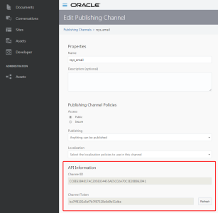 전자메일 및 모바일용 게시 채널을 열고 각 채널의 해당 채널 ID와 채널 토큰을 기록합니다. 게시 채널을 아직 생성하지 않은 경우, Oracle Content and Experience Cloud 문서를 참조하십시오.