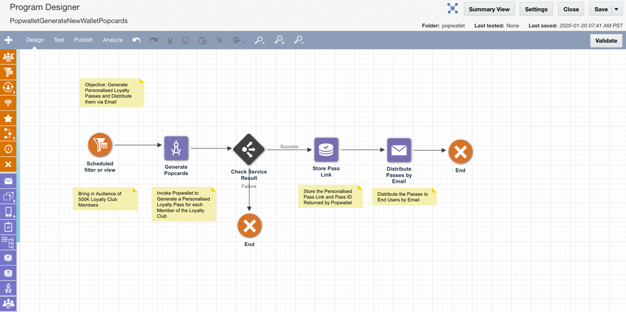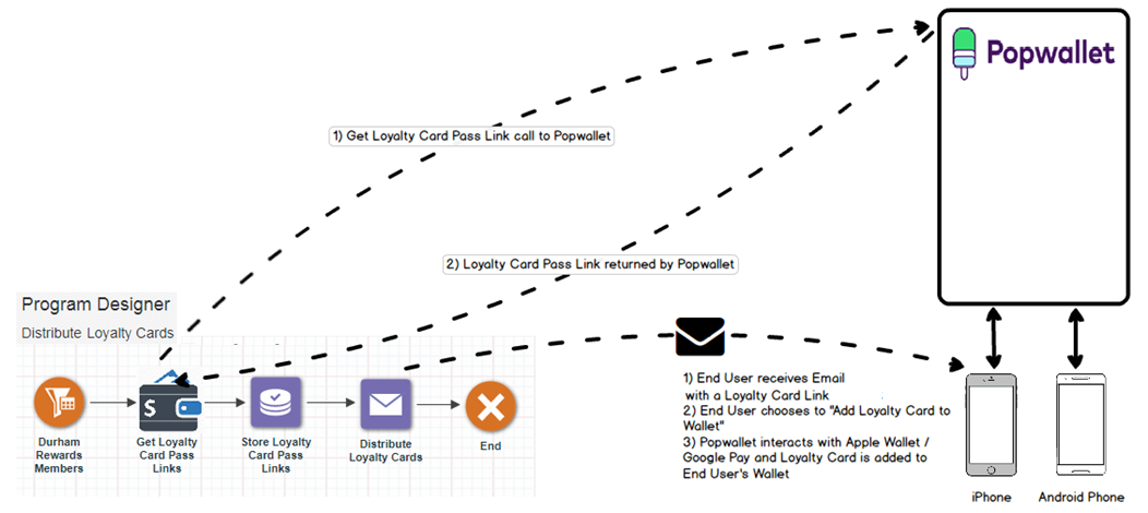 한 가지 예로 디지털 충성도 프로그램이 있습니다. 마케터는 Popwallet과 상호작용하여 개인설정된 패스 링크를 얻는 Popwallet 앱 서비스 단계가 포함된 프로그램을 Responsys에서 생성하고 실행할 수 있습니다. 또한 마케터는 프로그램 플로우에 "캠페인 전송" 단계를 추가하여 전자메일, SMS 또는 조직의 모바일 앱을 통해 각 고객에게 개인설정된 패스를 배포할 수 있습니다. 충성도 카드 링크가 포함된 전자메일을 수신한 고객은 링크를 지갑에 추가할 수 있습니다. Popwallet은 수신자의 장치에 따라 Apple Wallet 또는 Google Pay와 상호작용하며, 충성도 카드가 수신자의 모바일 지갑에 추가됩니다.