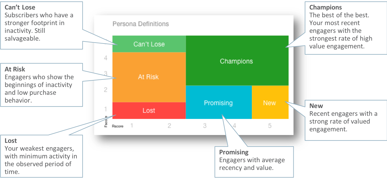 - 빈도(F) 점수: 프로파일의 빈도 점수는 전자메일 캠페인에서 프로파일 열기 수, 클릭 수, 전환 수 및 전송 이벤트의 가중 계산을 활용하여 계산됩니다.
