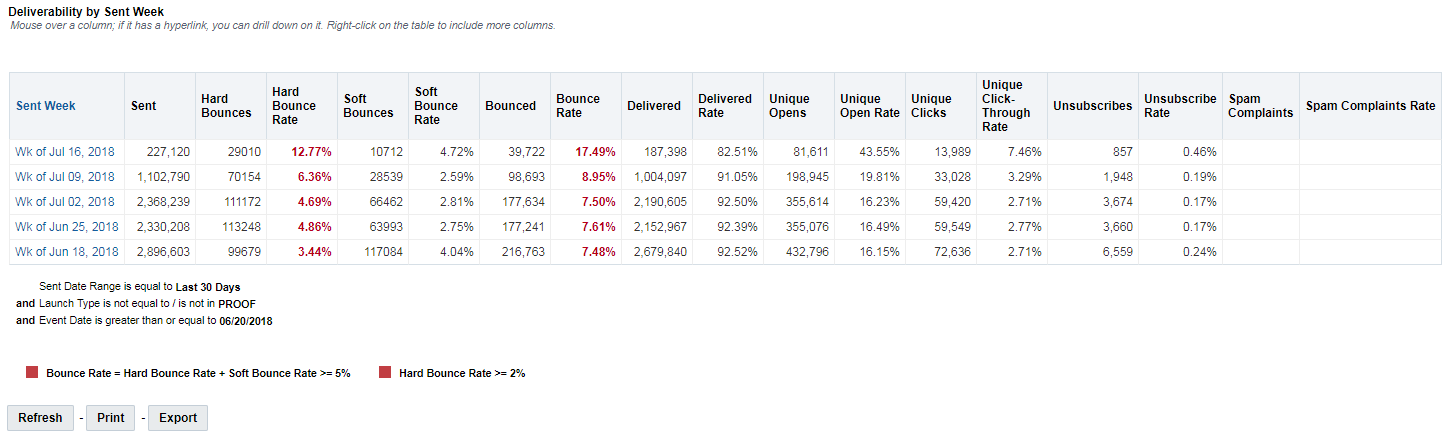 Эта информационная панель помогает анализировать эффективность доставки по неделям. Дополнительные сведения об анализе возможности доставки в конструкторе сообщений электронной почты.