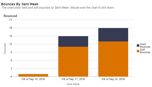 На этой диаграмме обозначены категории сообщений о проблемах доставки с возможностью повторной передачи по неделям отправки. Наведите курсор мыши на диаграмму и щелкните столбец для детализации до конкретной недели отправки. Столбцы разного цвета обозначают разные категории сообщений о проблемах доставки с возможностью повторной передачи для этой недели: ошибки, недопустимые сообщения, недопустимый метод или ошибка сервера.