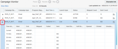 - При открытом мониторе кампаний щелкните на кампании, которую хотите приостановить. Кампания должна быть в состоянии Отправка или Подготовка. Фильтры монитора кампаний можно использовать для быстрой фильтрации этих кампаний.