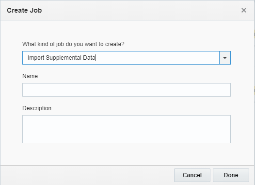 - Выберите Импорт дополнительных данных в раскрывающемся списке и укажите имя и описание задания импорта.