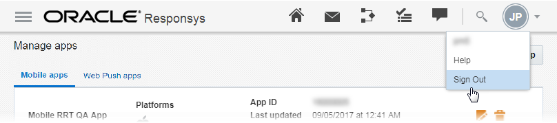 您可以管理 Responsys 账户设置。在 Manage apps(管理应用程序)页中,单击 Responsys 导航图标可显示菜单,然后选择 Account(账户)。