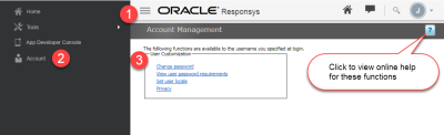 此时将显示账户管理页面。可以使用此页上的链接来更改密码、查看密码要求、设置区域设置,以及查看 Oracle 隐私策略。