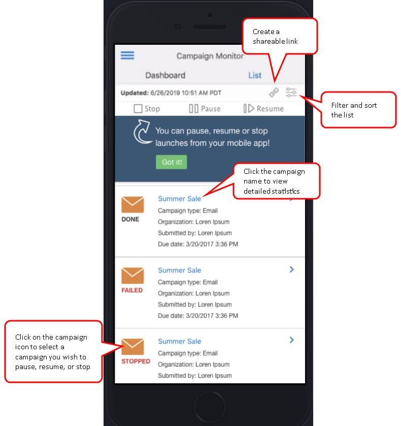 可以在 Android 或 iOS 设备上使用市场活动监视器来查看市场活动统计数据以及对在过去 24 小时内发送的市场活动进行快速健康状况检查。还可以生成指向报告的可共享链接并发送给不必登录到 Oracle Responsys 即可查看该链接的同级。