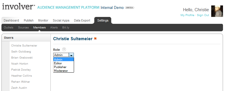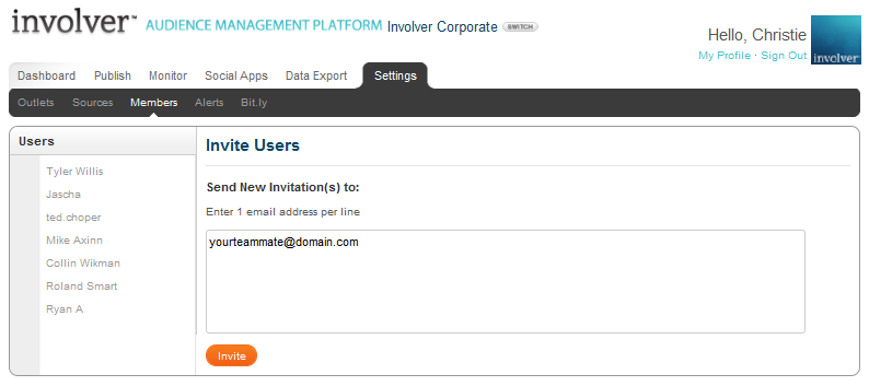 One of the great features of Involver's Audience Management Platform is the ability for multiple users to access a given campaign. To add additional users, simply click “Settings” and then “Members”. You will see a blank text box to enter email addresses of invited users. Once a user has been added, they will receive an email letting them know they have been invited. The “Users” list on the far left allows you to see who currently has access.