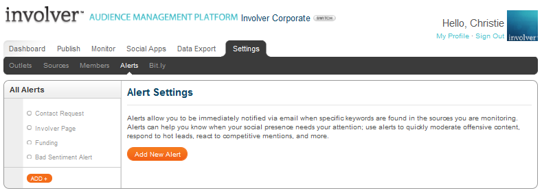 Our Alert feature provides email updates and the ability to flag and filter content including inflammatory language and comments about competitors. The keyword select component brings up content based on the words you choose and allows you to surface relevant postings within moments of when they appear. This helps you stay in the loop and respond in real time to comments about your product or market niche. To set up an alert, navigate to “Alerts” under the “Settings” tab, and select “Add New Alert”. There are four simple steps: