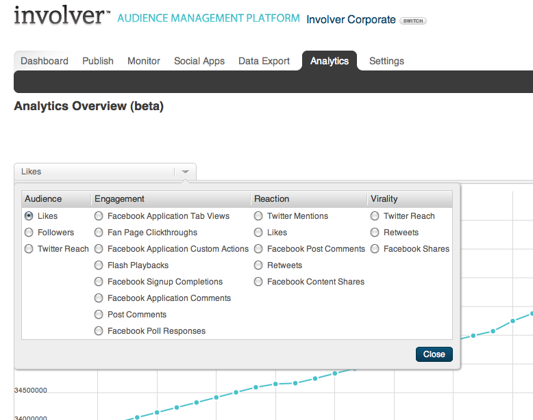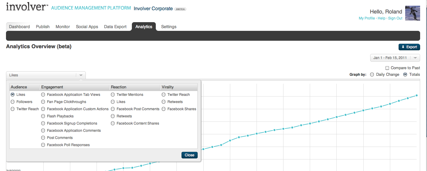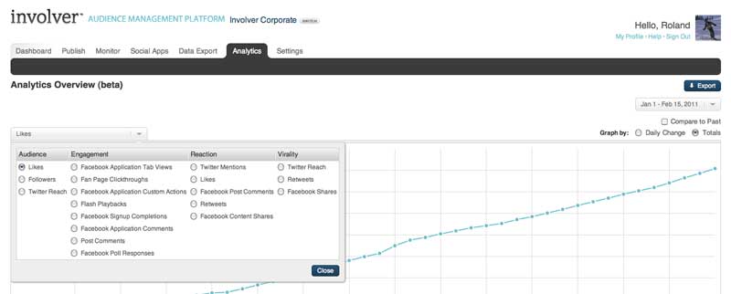 The Involver Analytics tab is the best place to understand the performance of your campaigns and export analytics data.Watch a quick demo of our analytics experience below: The analytics tab allows users to view a selection of metrics which are grouped by category. Set date range: The date range selector is located at the top right of the analytics tab and has two modes including, preset ranges and custom ranges. Preset ranges: Preset ranges let you quickly jump to one of the four present ranges.