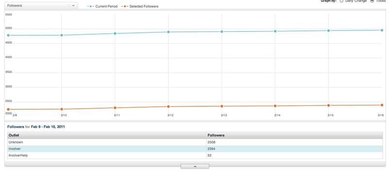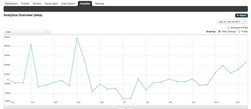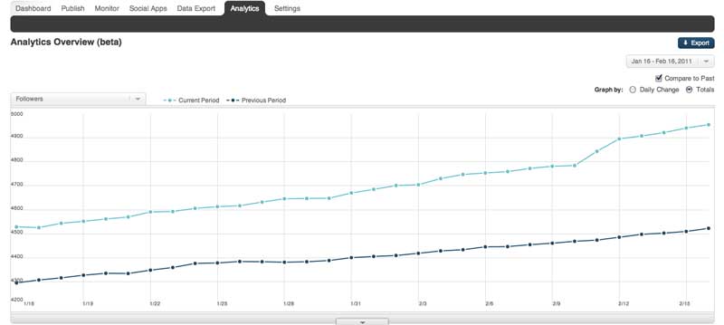Daily change: The Daily change mode allows you to see the daily change of your metric rather than the total value. This mode can be used concurrently with the compare to past mode. Drill drown drawer: On the bottom edge of the main graphing area there is a button that opens up a drill down drawer. This drawer contains more detailed information about the metric that is being shown in the main graph area. In the image below Twitter followers are being graphed and the drill down drawer shows there Twitter accounts that make up the total values. *Compare to total: Clicking on a selection in this window with graph that specific item and compare it to the total of all items shown in the drill down drawer. Quick Links: At the bottom of the analytics tab there is a selection of metrics which are grouped and include spark-lines that provide a glimpse into the data for the selected date range. Clicking on one of these spark-lines will load that metrics into the main graph at the top of the page as well as selecting that metric in the metric selection drop-down menu at the top left of the graph. Exporting data: Exporting data from the analytics tab is simple and is based on the date range selected. Simply click on the "export" button in the top left of the tab to download a .csv file of the data your are currently viewing. Have questions? Visit our Support Site to browse our Knowledge Base for specific Analytics use cases, or submit a support request for any unexpected behavior. Our Support Team is happy to help! |
