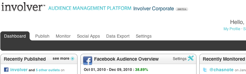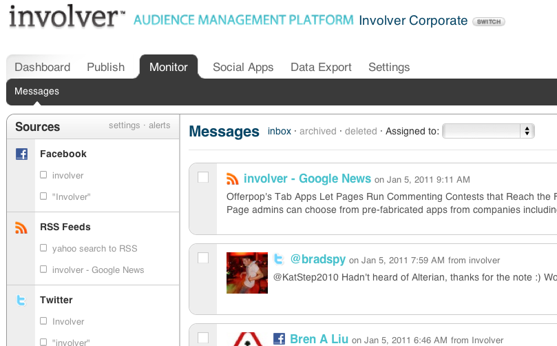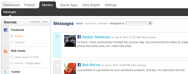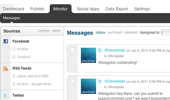 Alerts: When alerts have been assigned to you, you can also find them here. If you have not yet set up alerts, see the Alerts section under Setup. Alerts function identically to the Assign feature detailed above, and are titled however you name them. For example, if you create an alert for anytime there's a post to the Involver Fan Page and call it "Involver Page," it will appear as it does below.
