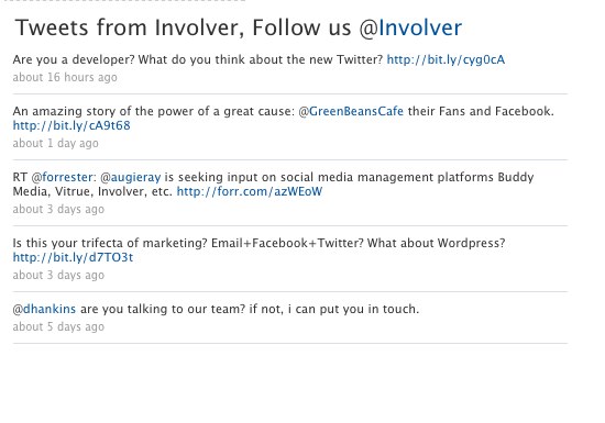 ExamplesBelow is an example of adding liking around each tweet item of a Twittter Feed feature block.<div class="twitter-box"> <h2>Tweets from Involver, Follow us<br /> @<a href="http://www.twitter.com/involver">Involver</a></h2> {% twitter_feed %} {% paginate twitter_feed.tweets per_page:5 %} {% for story in tweets %} <div class="tweet"> <h3>{{ story.title | twitter_link | auto_link }}</h3> <p>{{ story.published_relative_time }}</p> </div> {% endfor %} {% endpaginate %} {% endtwitter_feed %} </div> Will output: