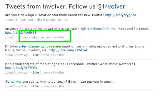 Now let's add in the {% content_like %} tag:<div class="twitter-box"> <h2>Tweets from Involver, Follow us<br> @<a href="http://www.twitter.com/involver">Involver</a></h2> {% twitter_feed %} {% paginate twitter_feed.tweets per_page:5 %} {% for story in tweets %} <div class="tweet"> <h3>{{ story.title | twitter_link | auto_link }}</h3> <p> {{ story.published_relative_time }} - {% content_like story %} </p> </div> {% endfor %} {% endpaginate %} {% endtwitter_feed %} </div> Save and reload the tab and you'll now see the Like links: