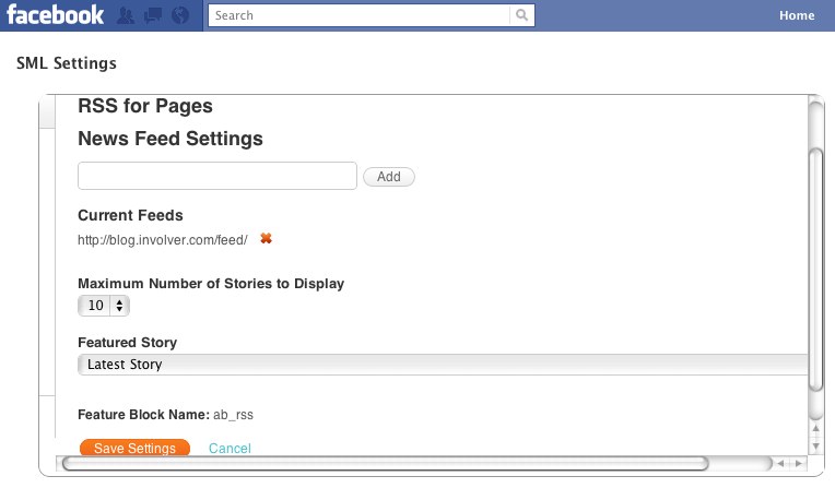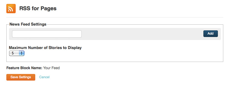 ConfigurationThe configuration settings for the RSS Feed include the feed(s) to pull in and the selection of what the featured story will be. You can associate multiple RSS feeds with the RSS Feed block. For Featured Story, you can either select one of the existing stories or you can choose to always feature the latest one. Your configuration screen may look different than the one below Caching ConsiderationsThis item is cached and will not update in real time. Currently this updates every 10 minutes, or when you update the rss_feed configuration. Block Attributes
