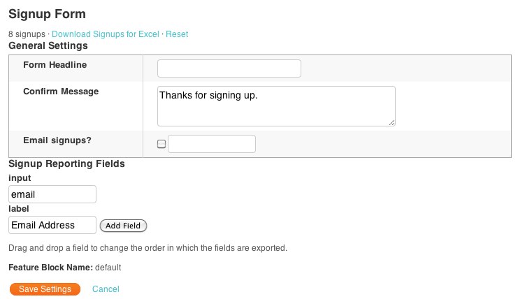 OverviewProvides the ability to create flexible signup forms with custom validations. ConfigurationTo configure which fields you want the signup_form feature block to collect is as simple as defining HTML form input tags in the body of your feature block definition. Please note that in order to export data you will need to configure matching export fields with the same names as the fields in your form. Form field names cannot include spaces, you can use underscores instead. For example, if you wanted to collect an email address and the full name of a user, the following input tags would be defined: