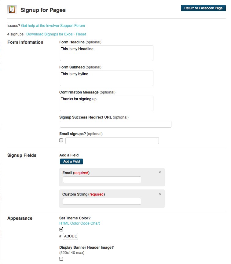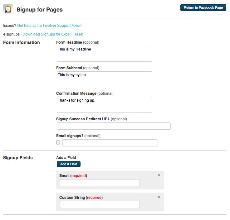 Validations are also defined within the template and then passed in via an attribute in the tag definition. See below for more examples. The only configuration that you then need to make is the settings for the fields that you wish to output when you export signups to CSV file format. Limiting entries per UserYou can also choose to limit how many times a user can enter and how frequently. You should be aware, however, that doing so will require the user to authorize the application to access their profile information since we need to grab their user id in order to track how many times they have submitted. Authorization requests can dramatically increase the bounce rate from your page so we recommend only using this option when absolutely necessary.